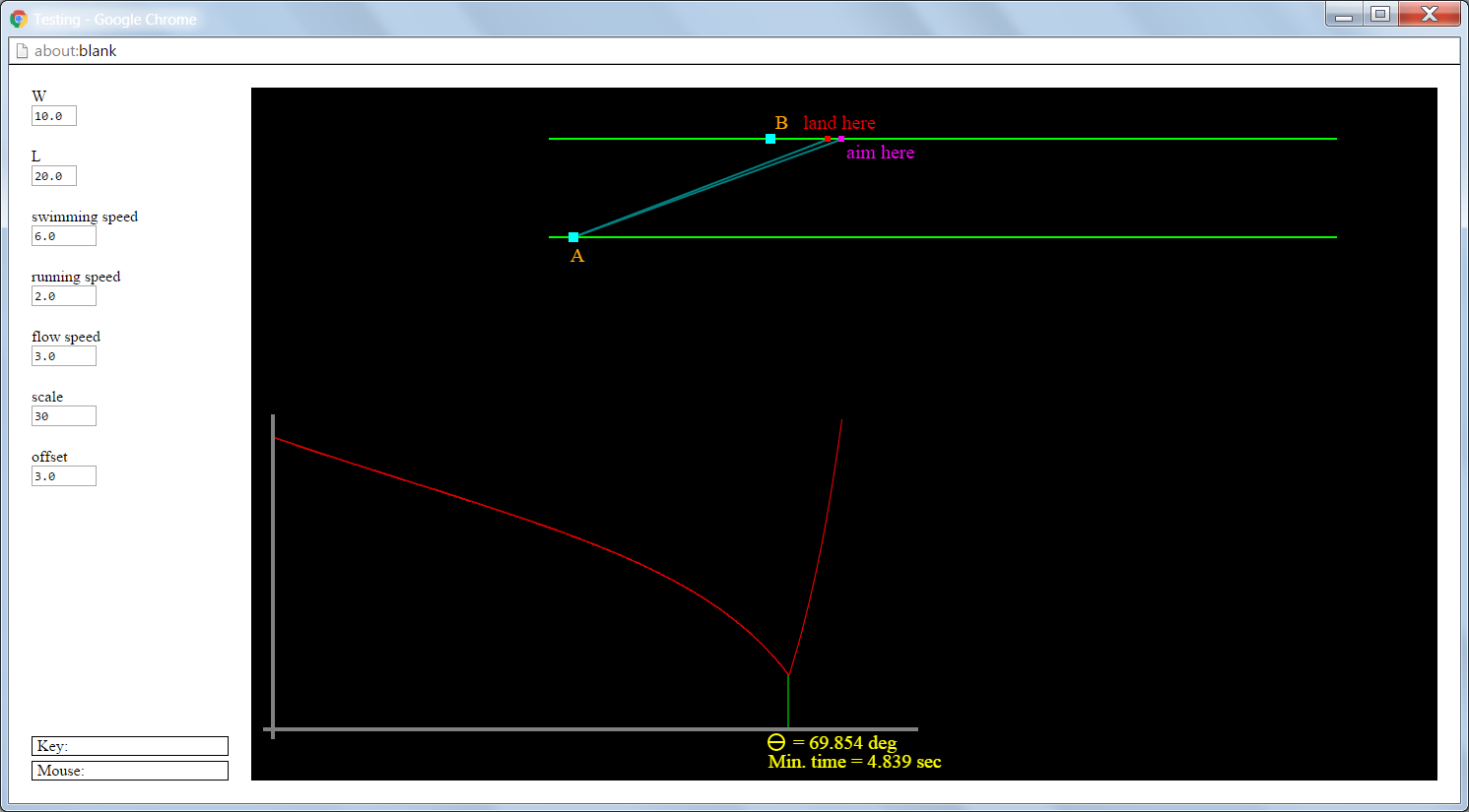 Check it out. It looks like the W and L don't matter. Just the ratio of velocities. But if the swimming speed is higher than the running speed plus flow speed, the result is meaningless. It turns out that even if it is close, the angle it gives is ridiculous. It isn't obvious from any of this but the function has a discontinuity cusp where